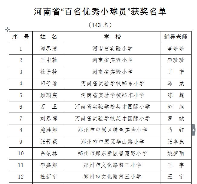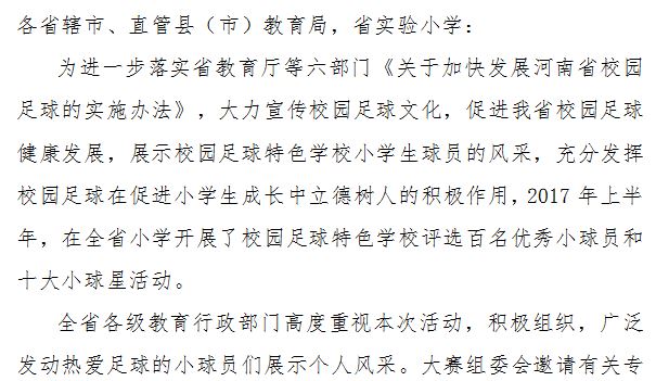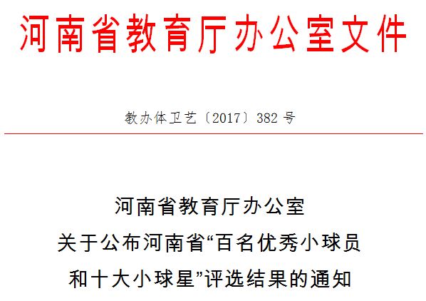 6月6日,河南省教育廳正式發(fā)文,向全省教育系統(tǒng)公布河南省首屆校園足球“百名優(yōu)秀小球員和十大小球星”的評(píng)選結(jié)果。