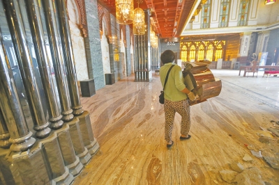 大廳內(nèi),金碧輝煌的樓頂和墻體以及各種燈飾等都還沒有拆除,大廳東側(cè)的一處1尺高的平臺正在拆除。在切割、拉扯、裝卸等雜音交響中,東北角一名工人拿著大錘對著室內(nèi)非承重墻猛砸,已砸出一個(gè)大窟窿。很顯然,這里正進(jìn)行大規(guī)模拆除。