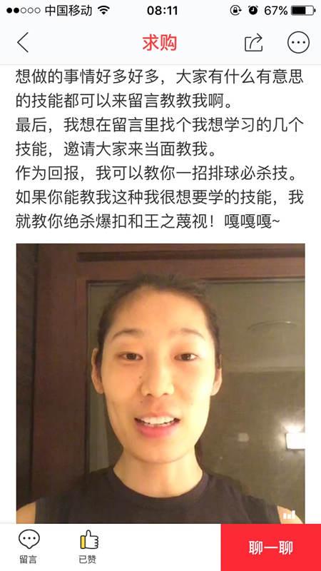 拜MVP為師,難道僅憑一招扯燴面的手藝?8月27日,女排主攻手朱婷在某分享經(jīng)濟平臺發(fā)布了求購視頻,透露了自己在緊張的訓練之余,希望學到諸如土耳其語、做燴面等新技能。而作為交換,她愿教對方一招“絕殺暴扣”和“王之蔑視”!中國女排MVP上網(wǎng)“賣藝”,分享經(jīng)濟的玩法說火就火。