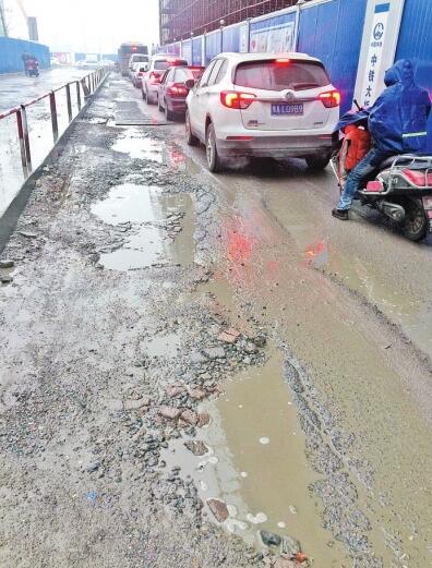 1月5日,記者來到鄭州農(nóng)業(yè)路與桐柏路交叉口附近,該處有農(nóng)業(yè)路快速通道工程。其中,該工程的保通路是一個雙向兩車道,私家車、電動車和行人共用一個車道行駛。一條寬約2米,長約100米的道路路基被碾軋破損,每隔1米就出現(xiàn)一個大坑。因天降小雨,大坑積水,讓本就狹窄的道路上車輛通行更加緩慢。其中,一部分大坑上面鋪有鋼板,但私家車經(jīng)過時碾軋鋼板,濺出1米多高的水花。