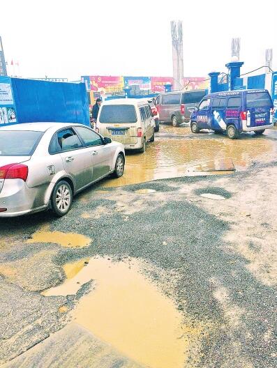 鄭州農(nóng)業(yè)路與沙口路附近的保通路上,交叉口東西兩側(cè)各有一處較大的深坑。西側(cè)一處深約20厘米,不少電動車主行至坑邊,不敢涉水通過,只能擠進(jìn)快車道行駛,非常危險;東側(cè)一處大坑面積約60平方米,水坑最深處可達(dá)30厘米,私家車從此經(jīng)過,濺起一片水花。該大坑正處一個丁字路口正中央,且沙口路、農(nóng)業(yè)路的車輛僅有此處一條通道,因車輛通行緩慢,路面私家車排起一條長龍。