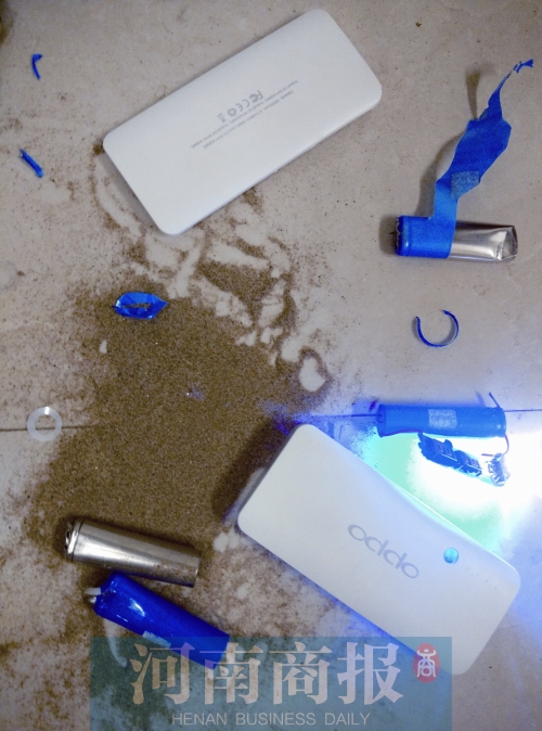 離開后,河南商報記者將充電寶拆開,看到充電寶中部分蓄電池與其他電池獨立分開,根本沒有導線,而沒有導線的電池里,裝滿了沙子?!皁ppo”充電寶中共有5節(jié)電池,有2節(jié)與電板通過導線相連,剩下光禿禿的3節(jié)電池“自成一派”。用錘子敲碎2節(jié),從電池里流出了細沙。