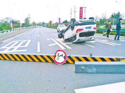 早上6時許,記者在現(xiàn)場看到,該處限高桿被撞斷后橫在路面上,斷桿的旁邊,一輛轎車四輪朝天地“躺”在路中間,將整個上橋口堵死,導(dǎo)致車輛無法上橋,只能走橋下,造成交通擁堵不堪。交警二大隊與中原區(qū)三官廟辦事處的巡防隊員,正在現(xiàn)場疏導(dǎo)交通。