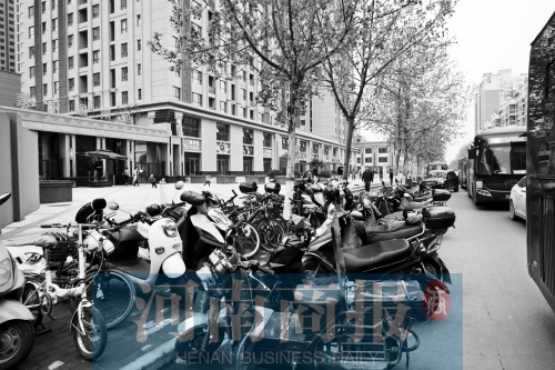 家住鄭州經(jīng)三路與廣電南路交叉口附近嘉辰麗景苑小區(qū)的李先生一直把電動車停放在小區(qū)大門外的人行道上。原因是小區(qū)非機(jī)動車停放點(diǎn)兒沒建好。而停放點(diǎn)建成后,物業(yè)要收費(fèi)。李先生等業(yè)主因此事與物業(yè)產(chǎn)生了分歧。
