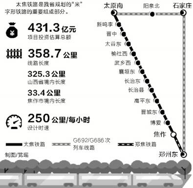 太焦鐵路是我省規(guī)劃的“米”字形鐵路的重要組成部分,項(xiàng)目投資估算總額為431.3億元,線路長(zhǎng)度358.7公里,其中山西省境內(nèi)325.3公里,我省焦作市境內(nèi)33.4公里。工程計(jì)劃建設(shè)周期為5年,設(shè)計(jì)時(shí)速為每小時(shí)250公里。全線設(shè)太原南、新鳴李、晉中、太谷東、榆社西、武鄉(xiāng)西、襄垣東、長(zhǎng)治東、長(zhǎng)治縣、高平東、晉城東、博愛及焦作13個(gè)車站。