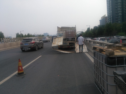 據(jù)貨車司機(jī)介紹,他車上拉的這些邊長(zhǎng)約1米的方形大桶是裝醬油用的,當(dāng)天拉著這些空桶從新鄭來到鄭州,因?qū)β窙r不熟,不知道此處上橋口有3米的限高桿,直到上橋時(shí)撞上限高桿后,才知道貨車不讓上三環(huán)立交橋。