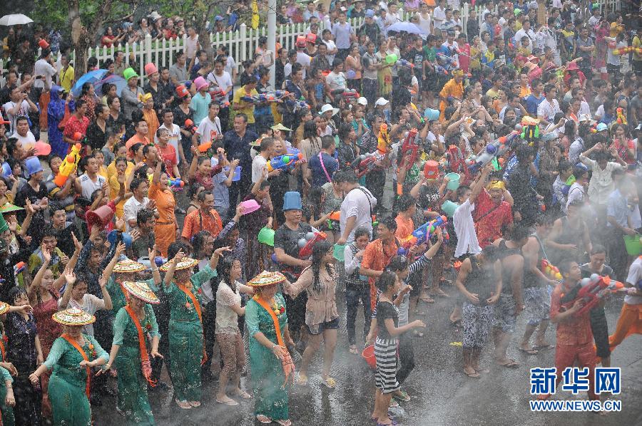 4月12日,各族群眾和游客在德宏芒市廣場(chǎng)上體驗(yàn)潑水狂歡。當(dāng)日,云南省德宏傣族景頗族自治州繼續(xù)舉行2013年國(guó)際潑水狂歡節(jié),各族群眾和游客歡聚在德宏芒市廣場(chǎng)狂歡潑水,祈福吉祥平安。 新華社記者秦朗 攝