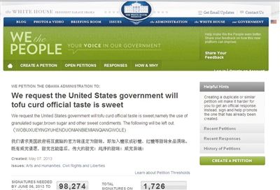 9日,網(wǎng)站最新的一則請?jiān)甘恰拔覀冋埱竺绹【啽本┘屣灩印?。截至發(fā)稿時,這一請?jiān)敢呀?jīng)有405人簽名支持。之前,“我們?nèi)嗣瘛本统霈F(xiàn)過類似的中文請?jiān)?,如要求“將豆腐腦的味道定為甜味”。目前該請?jiān)敢延?694人簽名支持。