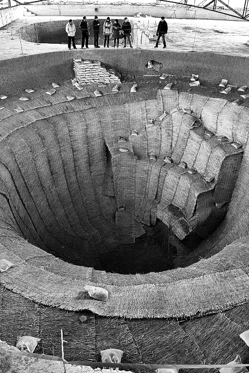 昨日,在回洛倉考古發(fā)掘現(xiàn)場,大河報(bào)記者看到這里已清理出兩座倉窖及周邊12座倉窖的開口位置,清理出倉城內(nèi)兩條主要道路,工作人員正在對南側(cè)兩座倉窖進(jìn)行發(fā)掘?!霸诎l(fā)掘過程中我們找到了一段城墻,寬約3米?!睋?jù)洛陽市文物考古研究院隋唐研究院王炬介紹,通過城墻位置,基本可以確定倉城的面積,整座倉城分為倉窖區(qū)、管理區(qū)、道路和漕渠幾部分。