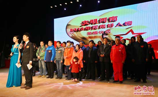 1月8月晚,“文明河南——2013年度《河南好人榜》發(fā)榜儀式”圓滿舉行,100名“河南好人”走上前臺,講述他們的感人故事。河南省委宣傳部常務(wù)副部長王耀、副部長李宏偉,省文明辦專職副主任郭守占,省廣電局副局長王仁海等到領(lǐng)導嘉賓出席了儀式。