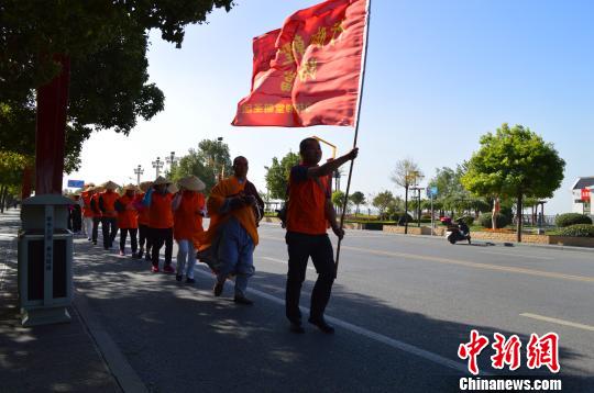 圖為朝圣團一行30人在少林寺延偵法師、延宗法師的帶領(lǐng)下,徒步行腳?!∩倭炙鹿﹫D 攝圖為朝圣團一行30人在少林寺延偵法師、延宗法師的帶領(lǐng)下,徒步行腳?!∩倭炙鹿﹫D 攝