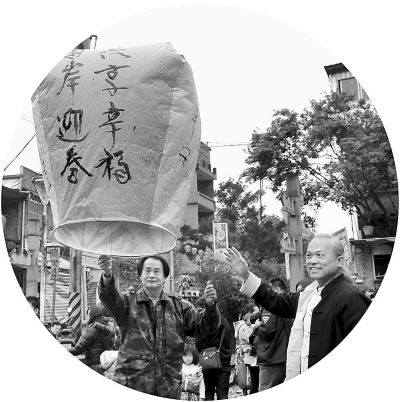 近日,臺灣毫芒雕刻家陳逢顯(右)與傳統(tǒng)天燈工藝大師林國和(左)一起放飛寫有“兩岸迎春· 共享幸?!钡奶鞜?。新北市平溪區(qū)放天燈久負(fù)盛名,已有百余年歷史。 王東明攝