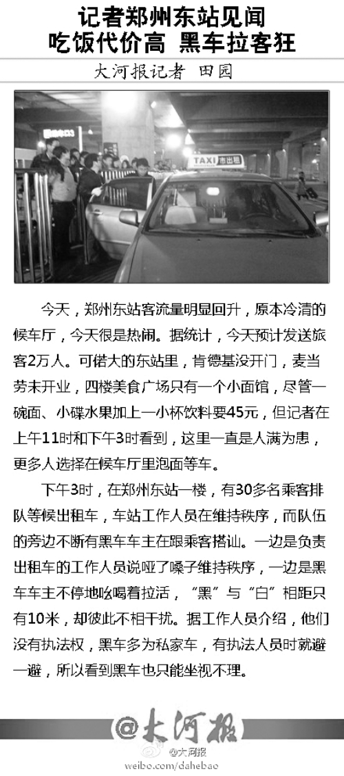 昨天,鄭州東站迎來(lái)一次客流小高峰,當(dāng)天,共發(fā)送旅客將近2萬(wàn)人次。記者來(lái)到鄭州東站體驗(yàn)發(fā)現(xiàn),平素空曠無(wú)人的西廣場(chǎng),出現(xiàn)了很多乘客的身影,三樓候車(chē)室也很熱鬧。但與熱鬧場(chǎng)景不相配的是,鄭州東站很多細(xì)節(jié)還未顧及到,吃飯代價(jià)高,“黑出租”與“白出租”公然搶生意。