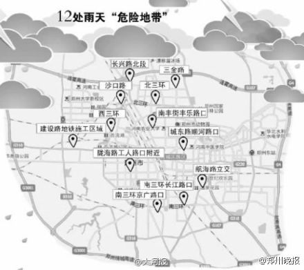鄭州市政工程管理處養(yǎng)護科負責人介紹說,經(jīng)過排查,市區(qū)內(nèi)有12個區(qū)域,一遇強降雨,極易出現(xiàn)較深積水,造成相關路段交通斷行。希望廣大市民在強降雨天氣條件下,繞行以下這些區(qū)域: