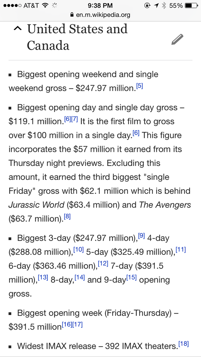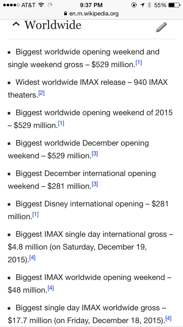 截圖只占該詞條的五分之一都不到哦,這齊刷刷的一片 Biggest/ Widest 真是氣壯山河啊!預(yù)計到本周末《星戰(zhàn)7》將在北美拿下5億票房,比前任紀(jì)錄保持者《侏羅紀(jì)世界》快了近整整一倍之多!”票房記錄粉碎機“之稱果然名副其實!
