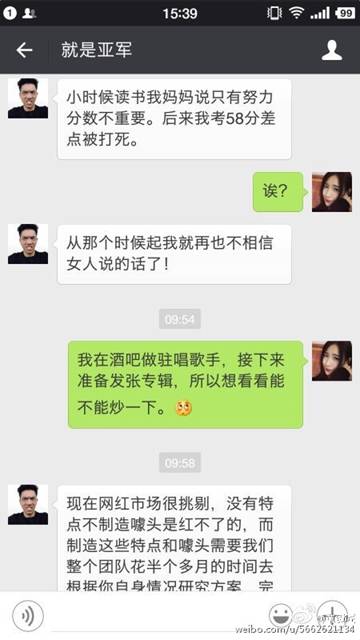 6月6日,某酒吧駐唱女歌手通過自己的微博發(fā)布了幾張聊天截圖。聊天內(nèi)容大意是酒吧駐唱女歌手找了一位可以網(wǎng)紅經(jīng)紀(jì)人,期望他能夠把自己炒成網(wǎng)絡(luò)紅人,而每次推成功一次紅人,大概費(fèi)用至少是20萬起。