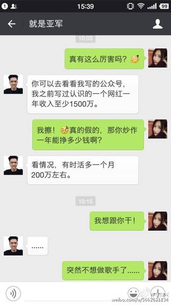 6月6日,某酒吧駐唱女歌手通過自己的微博發(fā)布了幾張聊天截圖。截圖內(nèi)容也是著實讓大家大吃一驚。聊天內(nèi)容大意是酒吧駐唱女歌手找了一位可以網(wǎng)紅經(jīng)紀(jì)人,期望他能夠把自己炒成網(wǎng)絡(luò)紅人,而每次推成功一次紅人,大概費(fèi)用至少是20萬起。該網(wǎng)紅經(jīng)理自稱打造網(wǎng)紅每月收入百萬。