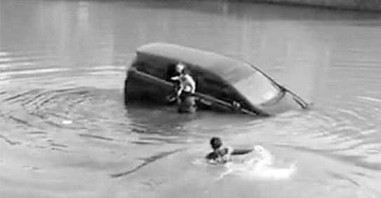 哪知,女司機(jī)大概嚇壞了,一下就沉下水去,郭剛馬上托她胳膊,助她浮起來。河水深2米多,郭剛連拖帶拽將她弄到岸邊。