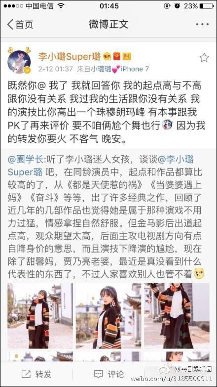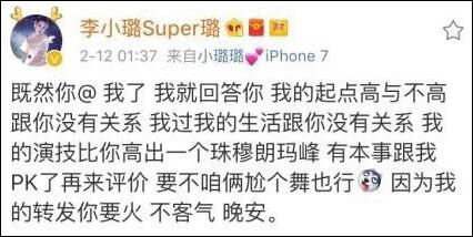 這條微博讓李小璐怒了。李小璐隨后轉(zhuǎn)發(fā)并寫(xiě)道:“既然你@ 我了,我就回答你,我的起點(diǎn)高與不高跟你沒(méi)有關(guān)系,我過(guò)我的生活跟你沒(méi)有關(guān)系,我的演技比你高出一個(gè)珠穆朗瑪峰,有本事跟我PK了再來(lái)評(píng)價(jià),要不咱倆尬個(gè)舞也行,因?yàn)槲业霓D(zhuǎn)發(fā)你要火,不客氣,晚安?!?/p>