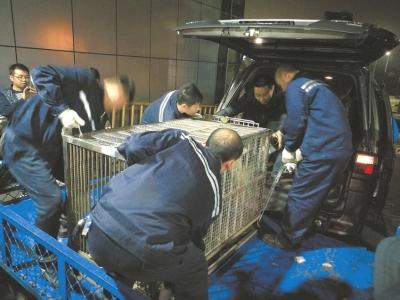 經(jīng)過近一個半小時的空中旅行,剛下飛機的“蜀蘭”還有一點驚慌。面對機場運輸工作人員,她有些焦慮地在籠子里轉(zhuǎn)來轉(zhuǎn)去,變換姿勢。