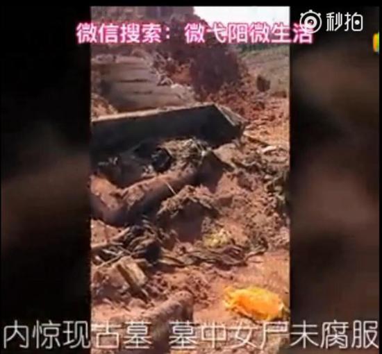 7月28日,在上饒市弋陽縣新看守所建筑工地,挖出一個古墓,現(xiàn)場掘出一口棺材,并發(fā)現(xiàn)一具保存尚為完好、身著疑似名門貴族服飾的女干尸。而在半年多前,2016年11月7日,同樣在江西上饒,上饒縣石獅鄉(xiāng)王家壩白領(lǐng)小組一處施工工地發(fā)現(xiàn)一處古墓。