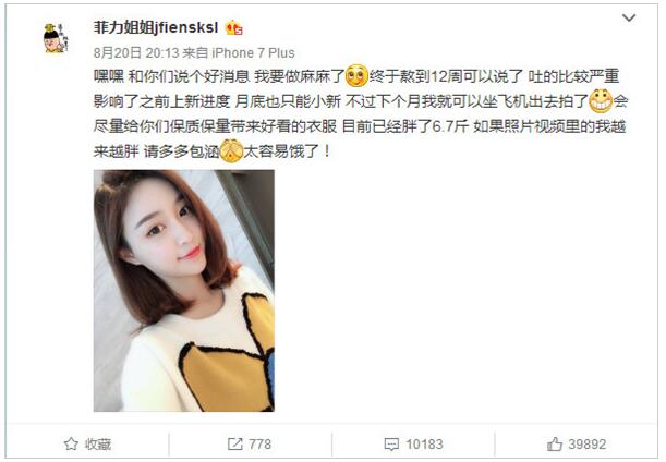 8月20,雪莉在小號(hào)微博@“菲力姐姐jfiensksl ”公布懷孕:“嘿嘿,和你們說個(gè)好消息,我要做媽媽了,終于熬到12周可以說了,吐的比較嚴(yán)重,影響了之前上新進(jìn)度,月底也只能小新,不過下個(gè)月我就可以坐飛機(jī)出去拍了。會(huì)盡量給你們保質(zhì)保量帶來好看的衣服,目前已經(jīng)胖了6.7斤,如果照片視頻里的我越來越胖,請多多包涵,太容易餓了! ”
