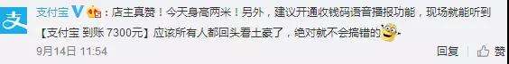 對此,支付寶官方表示,建議開通收錢碼語音播報功能,現場就能聽到“支付寶到賬7300元”,應該所有人都回頭看土豪了,絕對就不會搞錯的。
