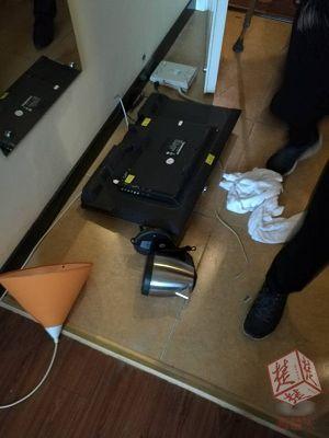 無奈,酒店工作人員只好用樓層房卡將6038號房打開。打開門,眾人驚呆了!一個(gè)沒穿上衣的小伙子正在玩手機(jī),房內(nèi)的電話機(jī)、電水壺、臺(tái)燈、電視機(jī)都被砸了,甚至連床板都拆了……
