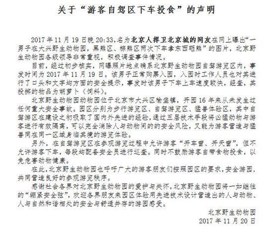 今天上午,記者從北京大興野生動物園了解到,該事件發(fā)生在園內自駕游覽區(qū)內,事發(fā)時間為11月19日,目前初步查明,男子投擲的物品為胡蘿卜(飼料)。