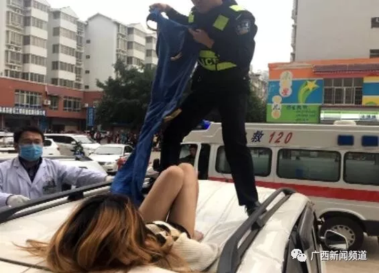 據(jù)來賓市公安局城警支隊(duì)東盟警務(wù)站覃警官介紹,當(dāng)天上午8時(shí)20分左右,他們接到群眾報(bào)警后趕到現(xiàn)場(chǎng),看到一名年輕女子躺在一輛面包車頂上,嘴唇出血,腰部有血跡。