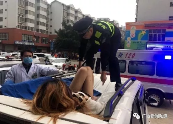 覃警官稱,年輕女子由于受傷嚴(yán)重,無法言語(yǔ),幾次掙扎著想坐立起來。他勸她別動(dòng),等待醫(yī)護(hù)人員。隨后,120醫(yī)護(hù)人員和城北派出所民警也趕到現(xiàn)場(chǎng),年輕女子被抬上救護(hù)車送往醫(yī)院搶救。到醫(yī)院后,城北派出所民警立即協(xié)助醫(yī)院辦好了相關(guān)入院手續(xù)。