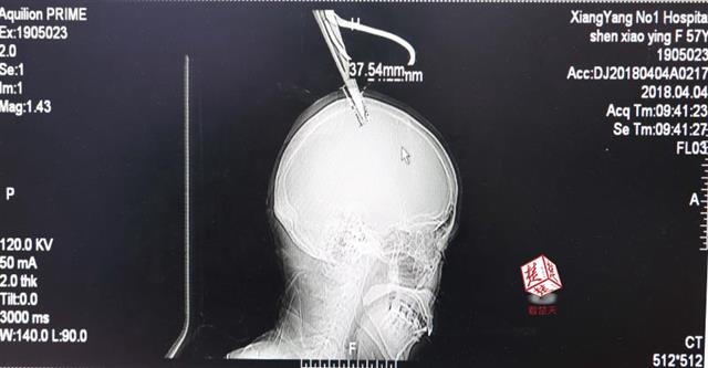 醫(yī)生檢查發(fā)現(xiàn),剪刀刀尖斜嵌在沈某顱骨里,離腦髓只有兩三毫米。所幸是斜著插進去,如果是垂直刺入,很有可能造成癱瘓。