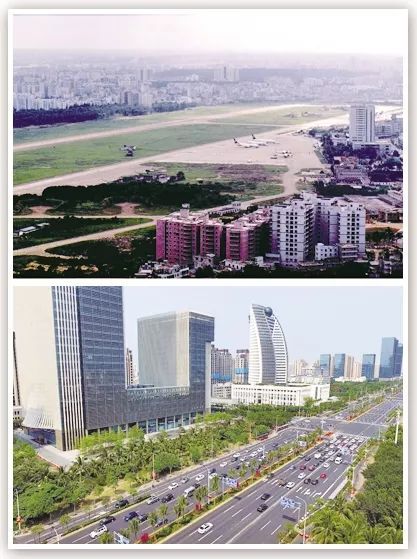 拼版照片為海口市國興大道,曾經(jīng)是海口大英山機(jī)場(上圖為1999年5月新華社記者姜恩宇攝,下圖為2018年4月14日新華社記者郭程攝)。 新華社發(fā)