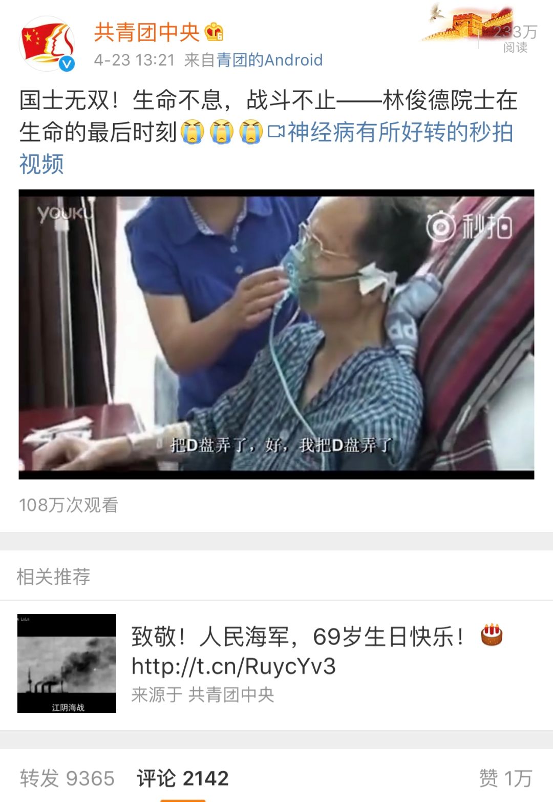 23日,@共青團中央 微博發(fā)的這個視頻,近萬網(wǎng)友轉(zhuǎn)發(fā),評論令人動容…