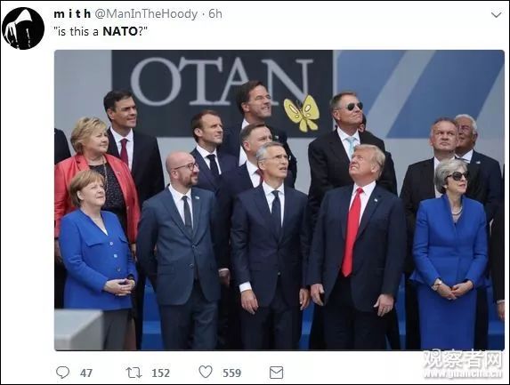 其實(shí),特朗普就是被抓拍到了某一刻。也許,這張照片火了,正是因?yàn)樗?jiǎn)單地描述了圖中主人公的關(guān)系,容易讓人浮想聯(lián)翩,想到特朗普對(duì)北約的不滿意、上臺(tái)以來熱衷于“退群”的行為,不管是馬克龍、默克爾還是梅,都曾和他意見相左,相互“開炮”。