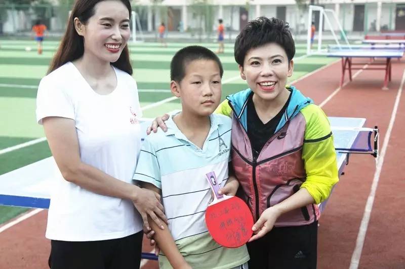 鄧亞萍與小隊長切磋球技 關(guān)注體育教育基礎(chǔ)發(fā)展