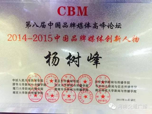 FM1041河南交通廣播榮獲2014-2015中國品牌媒體百強廣播媒體品牌10強。在河南廣播媒體中,僅此一個。這也是對河南交通廣播在節(jié)目、活動、服務方面成績的肯定。