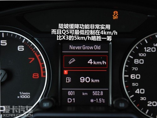 此刻的這輛Q5并未讓我們遇到諸如此類“半路折腰”的艱難險阻,因為quattro四驅系統(tǒng)絕不是等閑之輩,Torsen中央差速器會持續(xù)性將扭力源源不斷的輸送至前后軸,而此時EDL電子差速鎖的任務就只需要處理同軸上的打滑車輪,避免打滑車輪的動力流失,將動力傳遞至另一側車輪,從而最終實現(xiàn)經(jīng)中央差速器傳導而來的百分之百驅動力全部施加到有附著力的車輪。就這樣,經(jīng)過幾次挑戰(zhàn)性嘗試,這臺Q5還是比較輕松地完成攀爬且成功登頂。