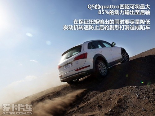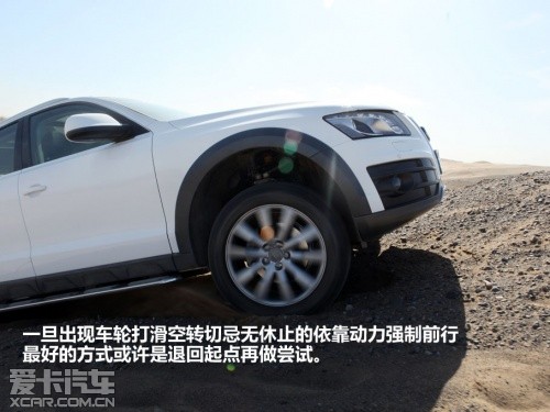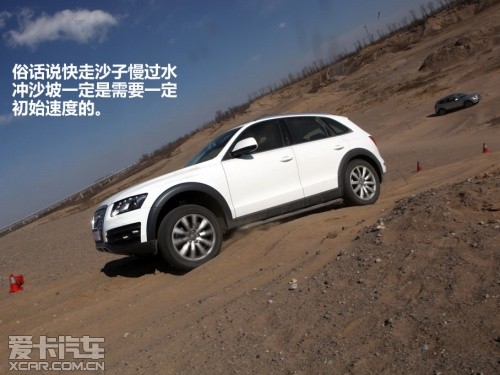 沙坡前半部分的坡度相對要緩一些,而奧迪Q5通過這里的過程自然也是毫不費力。那么在接下來更陡的后半部分當中,坡度的增大導致了車速急劇下降,此時松軟的沙子也就成為了車輛繼續(xù)攀爬的絆腳石,恰恰也就在此刻,檢驗quattro四驅系統(tǒng)真正能耐的時候隨之而來。