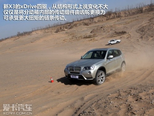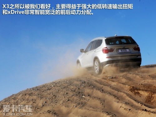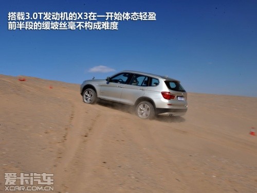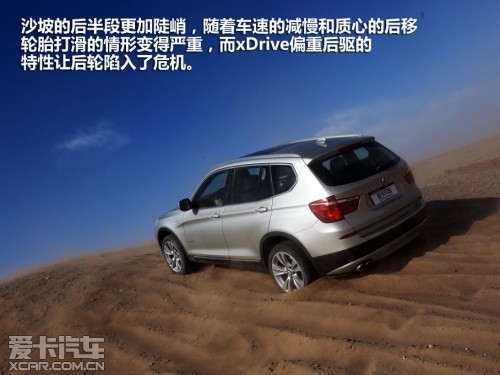 或許是奧迪Q5完成測試的過程比較順利,我們對接下來即將登場的寶馬X3也普遍比較看好,這或許就是思維慣性帶來的固定套路吧。然而在實地測試過程中,這臺X3攀爬沙丘的過程卻沒有表現(xiàn)出它在公路上所煥發(fā)出的霸氣。400牛·米的最大扭矩在城市道路中,甚至在高速公路上都是無與倫比的,但移步至眼前狂風大作的沙丘,這400牛·米的扭矩則像是心有余而力不足的悲情英雄。
