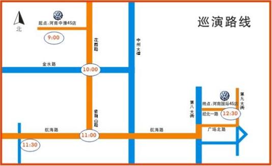 上午路線(xiàn):進(jìn)口大眾河南中豫4S店——紫荊山路——航海路——進(jìn)口大眾河南中豫航海路展廳——進(jìn)口大眾河南國(guó)際4S店