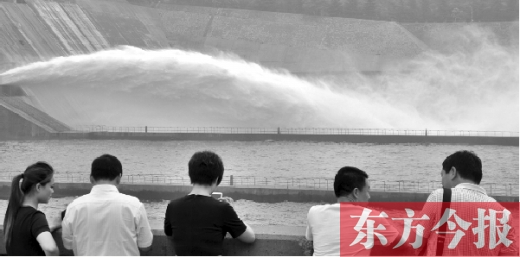 昨天,東方今報(bào)記者在濟(jì)源市小浪底庫(kù)區(qū)看到,9時(shí)一到,一條水龍從小浪底大壩口噴涌而出,驚濤拍岸。河水墜入河道濺起的細(xì)小水滴,撲打在附近游人的臉上,遠(yuǎn)遠(yuǎn)地就能感受到陣陣涼意。