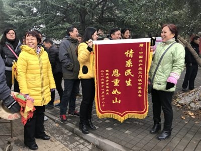 11月29日,三門峽市銀堤漫步小區(qū)數(shù)十位業(yè)主敲鑼打鼓冒雨將兩面寫有“情系民生 恩重如山”、“心系百姓 為民排憂”的錦旗送到三門峽市委和市政府,感謝新的領導班子為他們千余戶業(yè)主解決了存在五年的住房難問題。