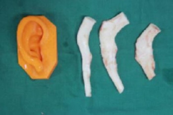 一期擴(kuò)張順利,1月5日進(jìn)行的是二期取肋軟骨再造耳廓的手術(shù)。術(shù)中引入3D打印輔助技術(shù),吳主任根據(jù)3D技術(shù)打印出來的耳廓模型進(jìn)行精細(xì)雕刻,雕刻的耳廓外形美觀、逼真,將成形的耳廓植入擴(kuò)張的皮膚內(nèi),術(shù)后效果良好。