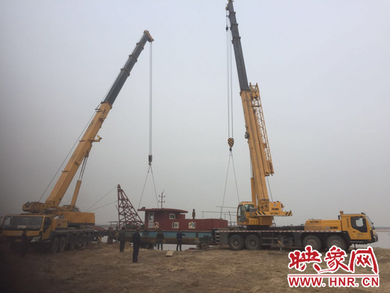 28日上午9時許,滎陽市多個執(zhí)法部門人員趕到王村鎮(zhèn)丁村黃河邊一處非法采砂船邊。經(jīng)過詢問得知,該船只重達70噸,必須由兩輛百噸大吊車同時起吊,才能將其吊離上岸。