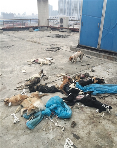 5日,西安醫(yī)學(xué)院一實(shí)驗(yàn)樓樓頂上,數(shù)十只狗身上滿(mǎn)是傷痕,有的疼得抽搐。愛(ài)心志愿者供圖