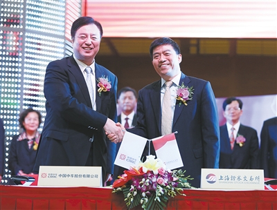 6月8日,中國(guó)中車股份有限公司副董事長(zhǎng)劉化龍(左)與上海證券交易所副總經(jīng)理徐明簽訂《上市協(xié)議書》。當(dāng)日,中國(guó)中車在上交所鳴鑼上市。
