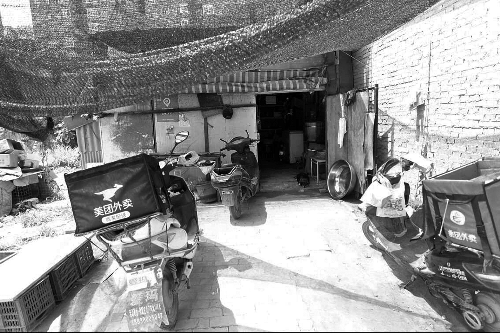 鄭先生所說(shuō)的作坊,位于某高校東門對(duì)面不遠(yuǎn)處的一座廢墟旁。如果不是在中午時(shí)分,店內(nèi)不斷傳出鍋勺碰撞的聲音和門口停著的幾輛后置送餐箱的電動(dòng)車,很難注意到這個(gè)僅有10多平方米大小、由破舊的門板搭成的小屋是一家“飯店”。