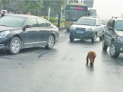 記者隨后致電鄭州市林業(yè)局野生動物救護站求助。在等待的過程中,這只“美猴王”引來不少市民圍觀,有市民拿出手機靠近拍照,“美猴王”猛地躥出,嚇得拍照的市民連退幾步。見人群漸多,“美猴王”坐不住了,跑到了商都路的快車道上,過往車輛見狀紛紛躲避(如圖),幾位巡防隊員在后面跟著,提醒車輛注意,但跟得緊了,“美猴王”還一度回過身來,試圖撲咬巡防隊員。