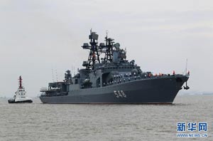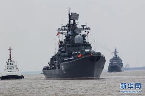 當(dāng)日,參加中俄“海上聯(lián)合—2014”軍事演習(xí)的俄方艦艇陸續(xù)駛抵上海某軍港。中俄兩國海軍互鳴禮炮,中方為來訪的俄艦舉行隆重歡迎儀式。俄羅斯太平洋艦隊旗艦“瓦良格”號導(dǎo)彈巡洋艦駛?cè)胲姼蹠r,參加歡迎儀式的軍樂隊奏響歡迎曲。隨后,“快速”號驅(qū)逐艦、“潘捷列耶夫海軍上將”號大型反潛艦、“伊利姆”號中型海洋油船、“涅維爾斯科伊海軍上將”號大型登陸艦,“卡拉爾”號海洋拖船陸續(xù)駛?cè)敫劭凇_@次聯(lián)合軍事演習(xí),中俄海軍都派出了主戰(zhàn)艦艇參加。中方參演兵力包括導(dǎo)彈驅(qū)逐艦、導(dǎo)彈護(hù)衛(wèi)艦、綜合補(bǔ)給艦以及導(dǎo)彈艇等水面艦艇8艘、潛艇2艘、固定翼飛機(jī)9架。俄方參演兵力包括巡洋艦、反潛艦、驅(qū)逐艦、登陸艦、油船和海洋拖船等水面艦艇6艘。此外,為執(zhí)行海上聯(lián)合解救被劫持船只、護(hù)航等特殊任務(wù),雙方還派出艦載直升機(jī)、特戰(zhàn)分隊等兵力參加此次演習(xí)。新華社記者 查春明攝